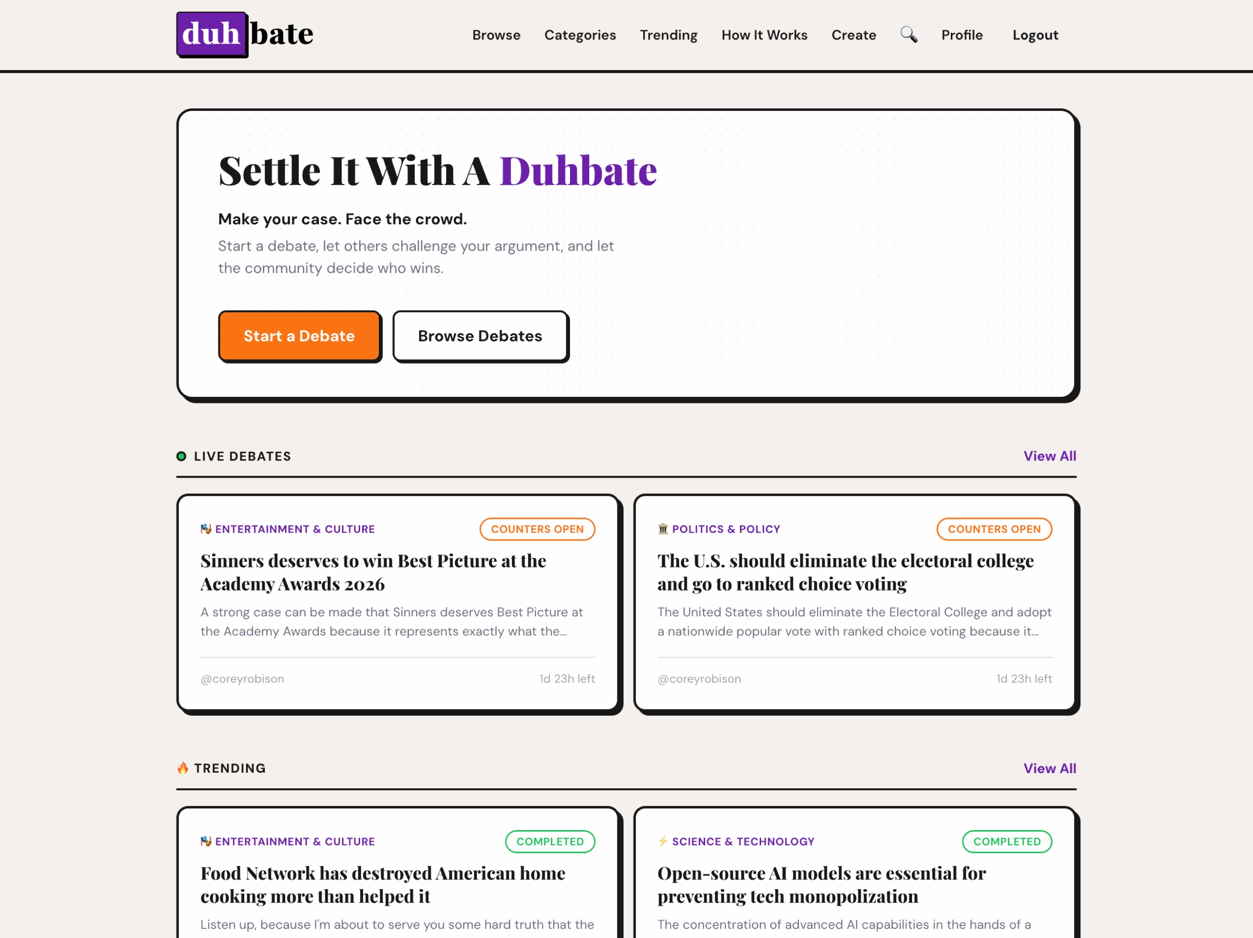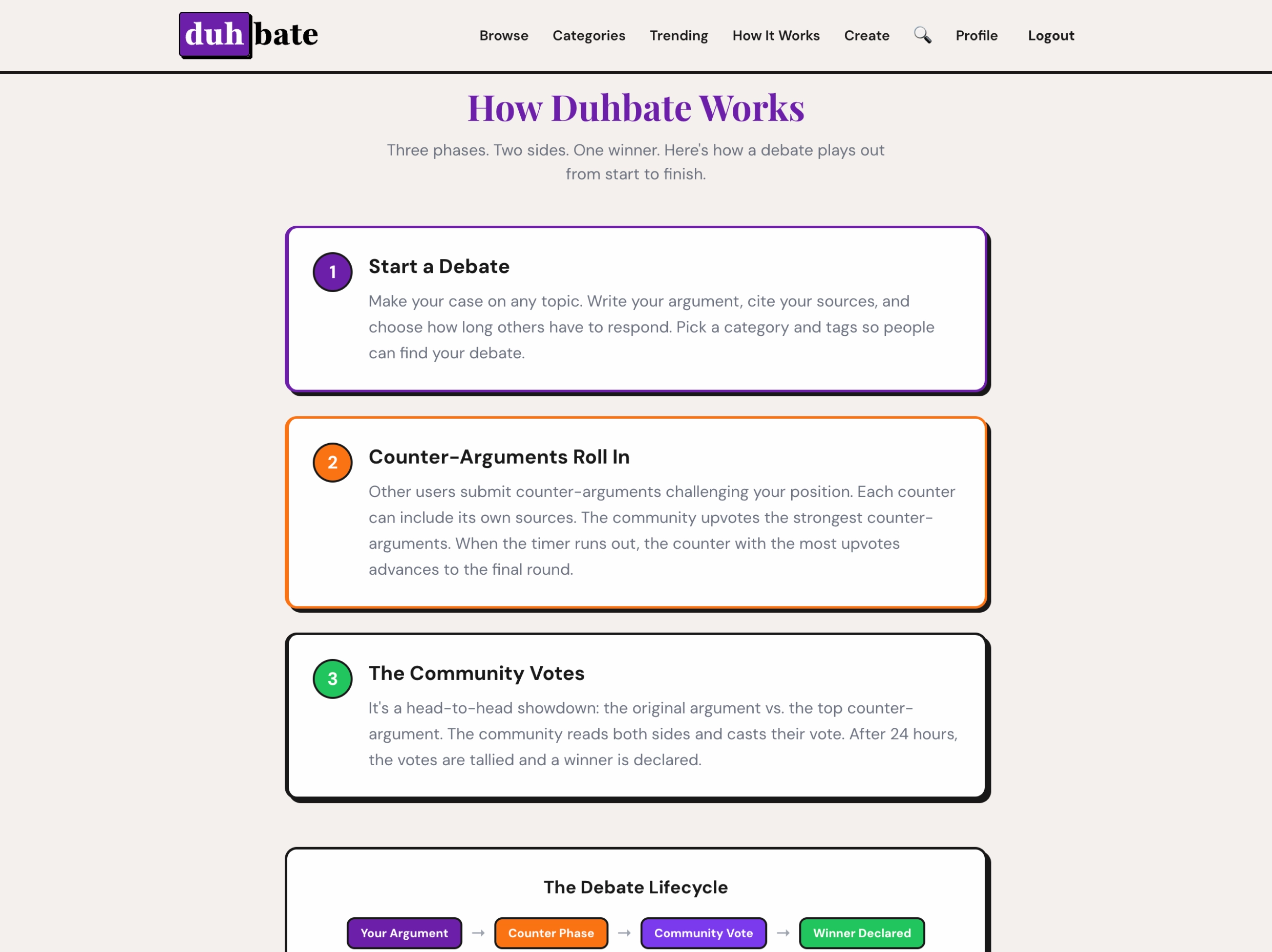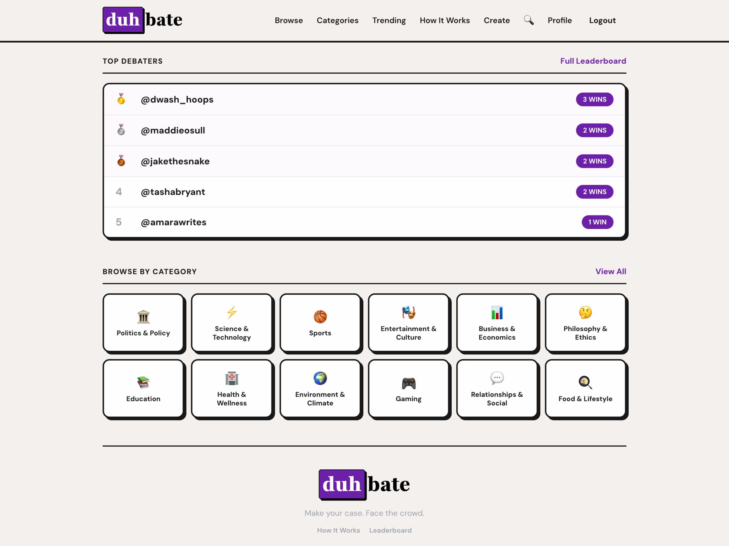 A community debate platform where you make your case, face a challenger, and let the crowd decide. Features timed phases, community voting, leaderboards, and category discovery.