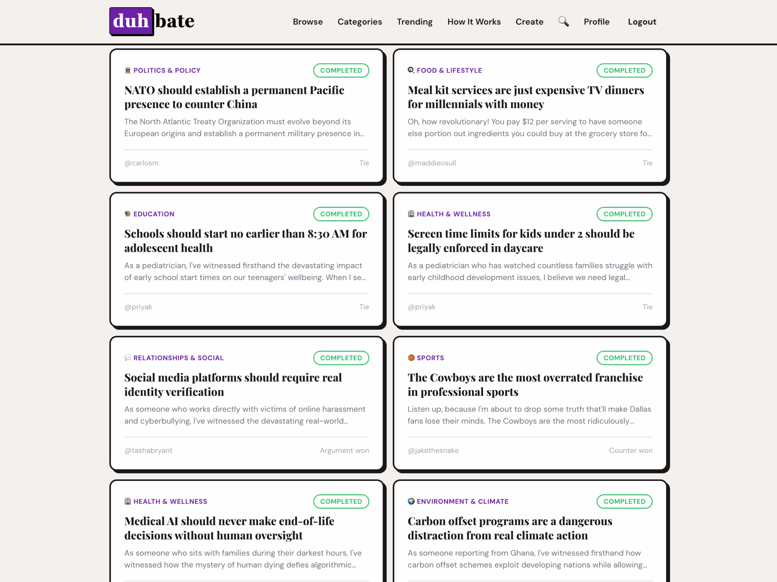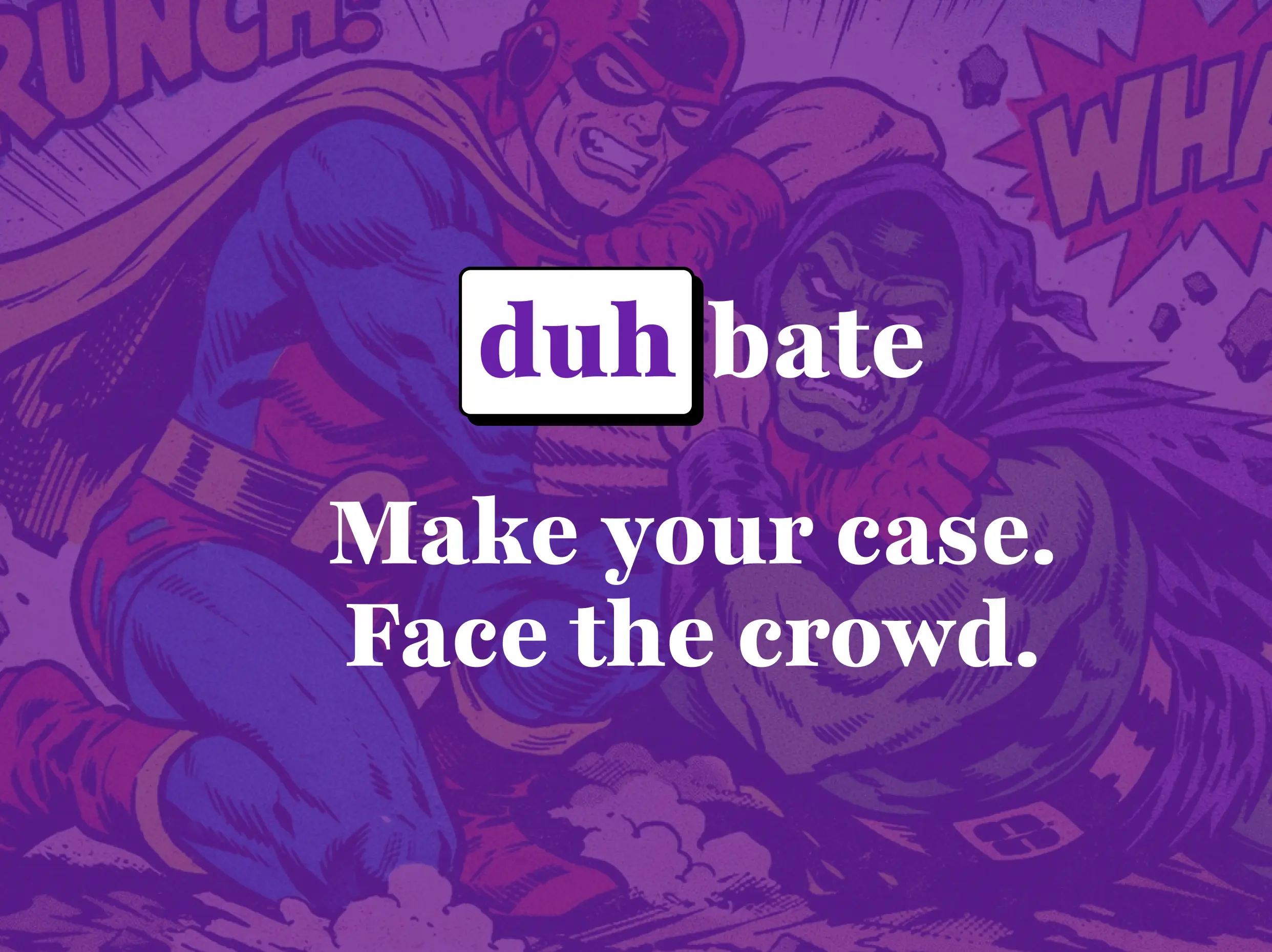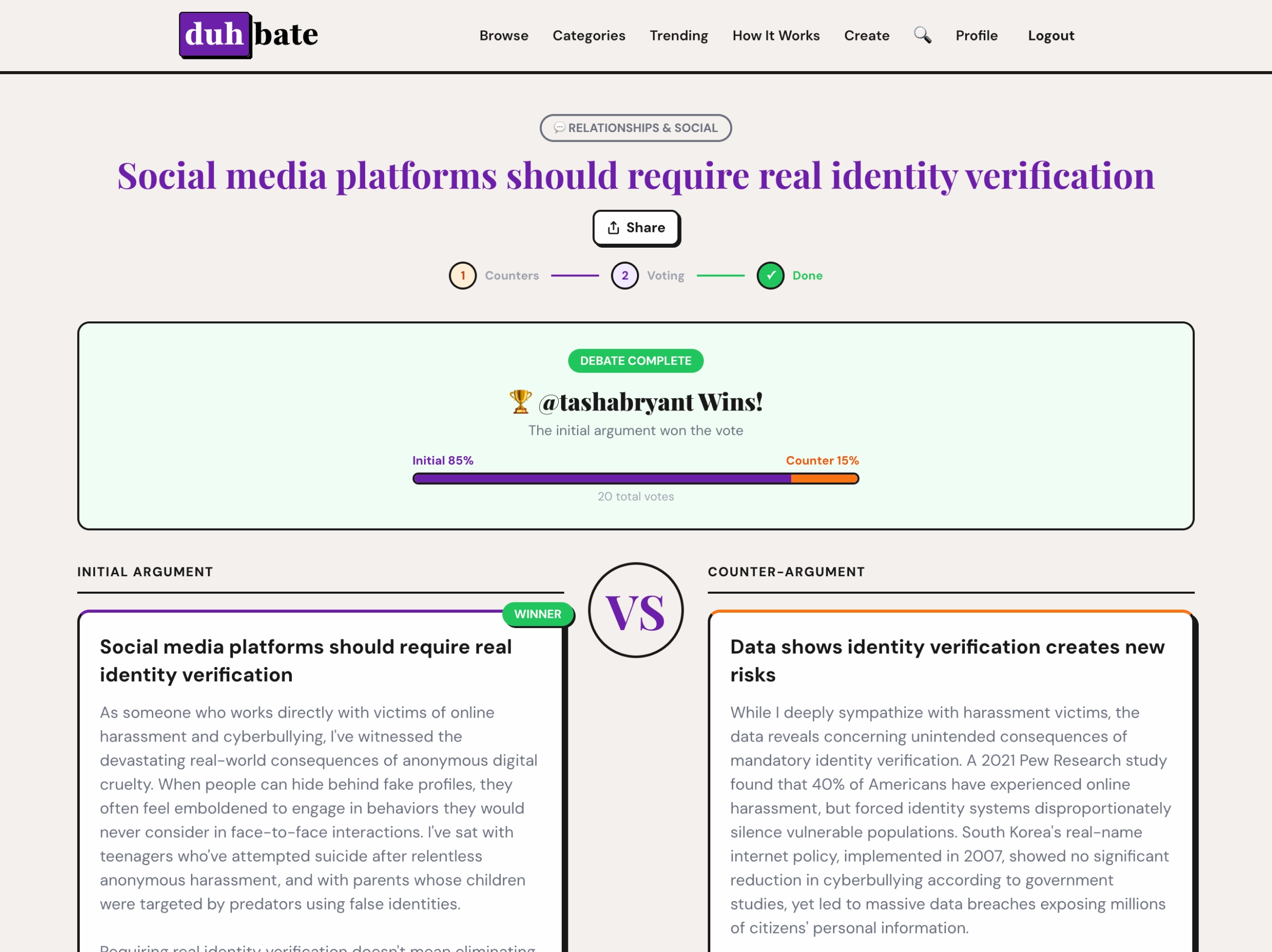 A community debate platform where you make your case, face a challenger, and let the crowd decide. Features timed phases, community voting, leaderboards, and category discovery.