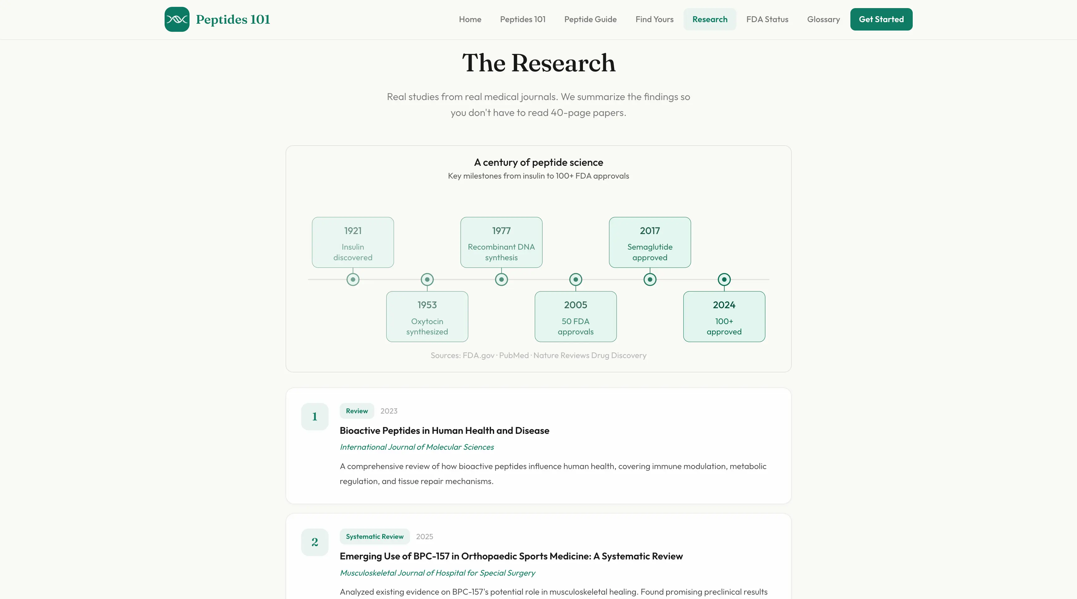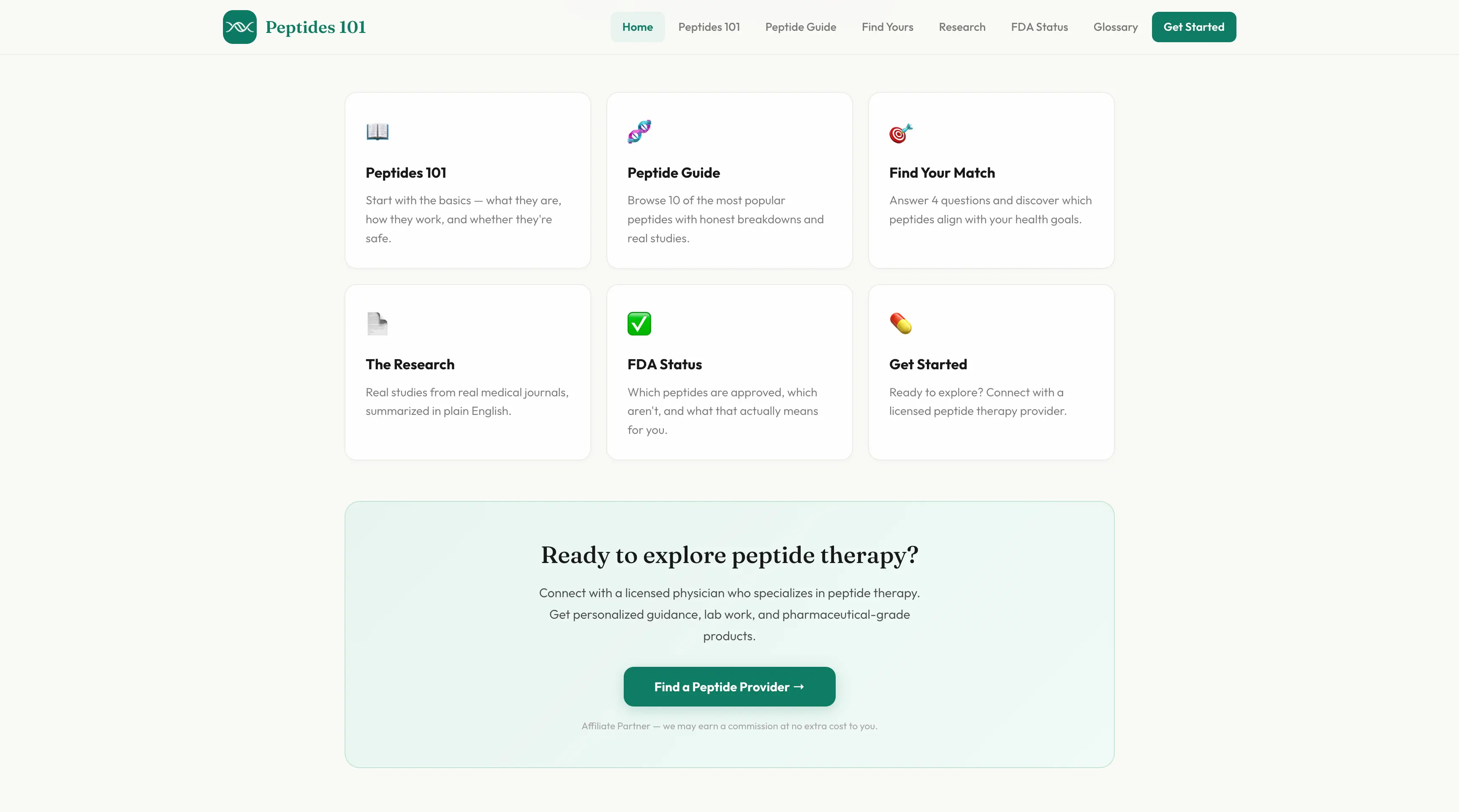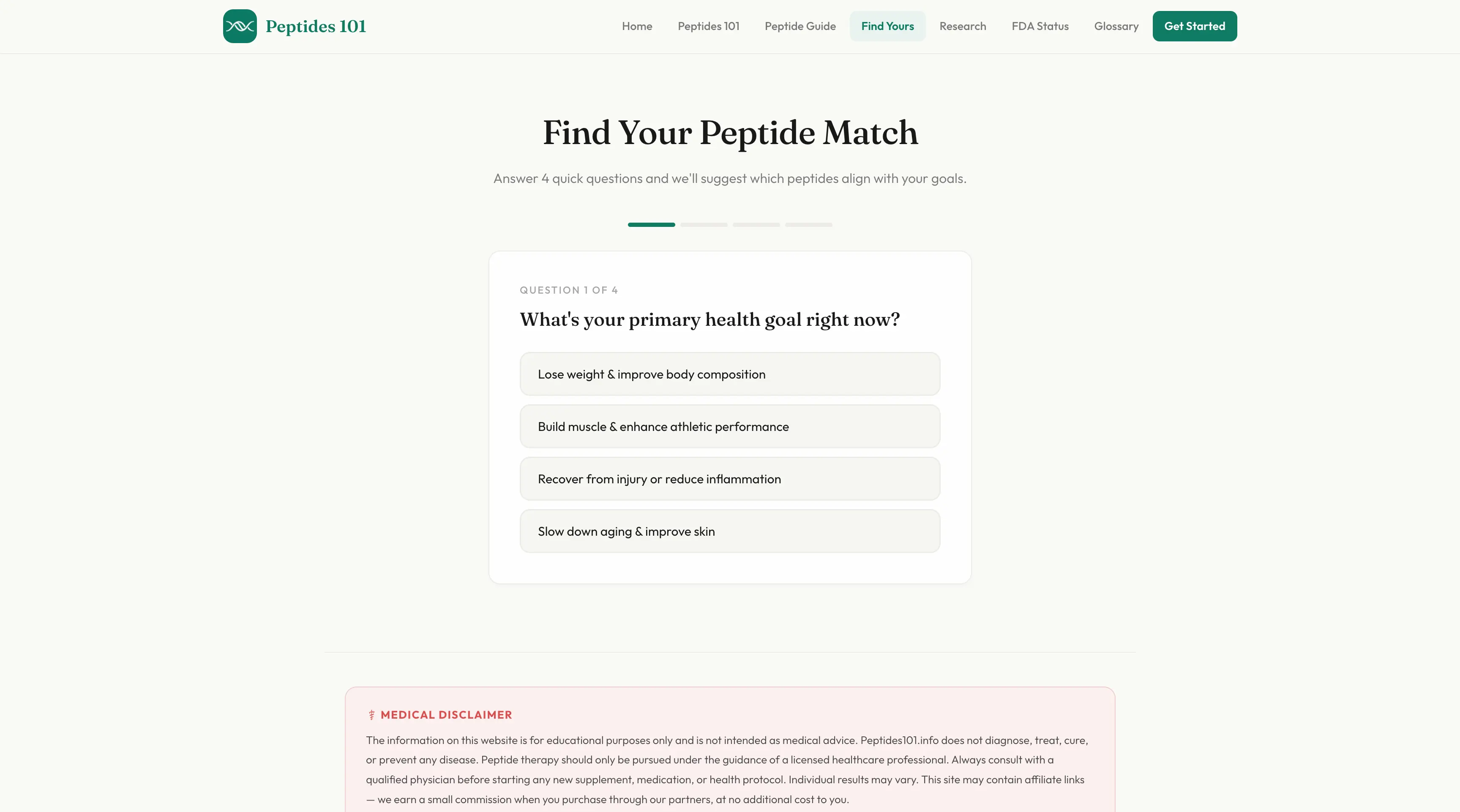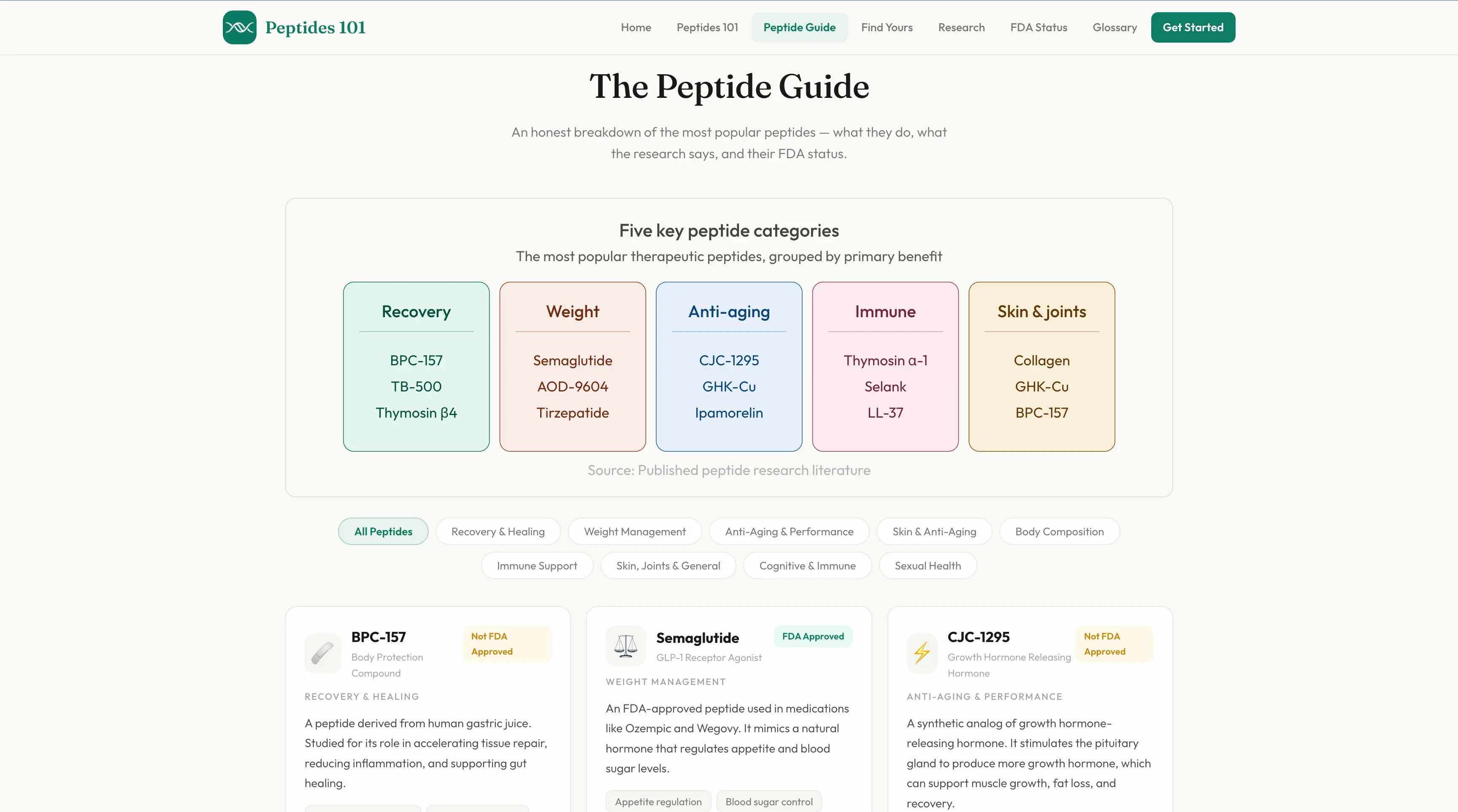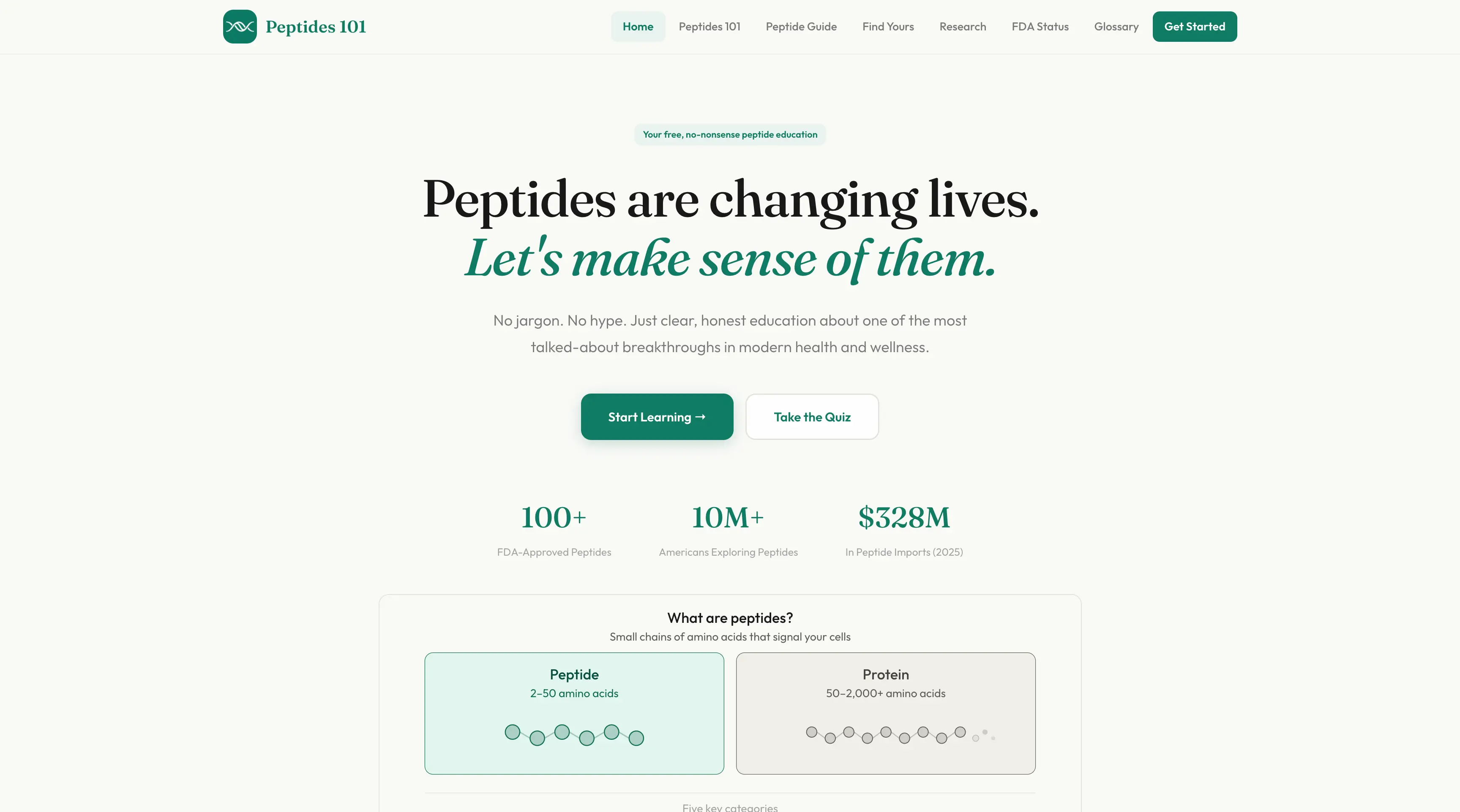 A free educational website making peptide therapy understandable for everyday people. Features plain-language guides, an interactive quiz that matches users to peptides based on their goals, and hand-coded infographics built in React.